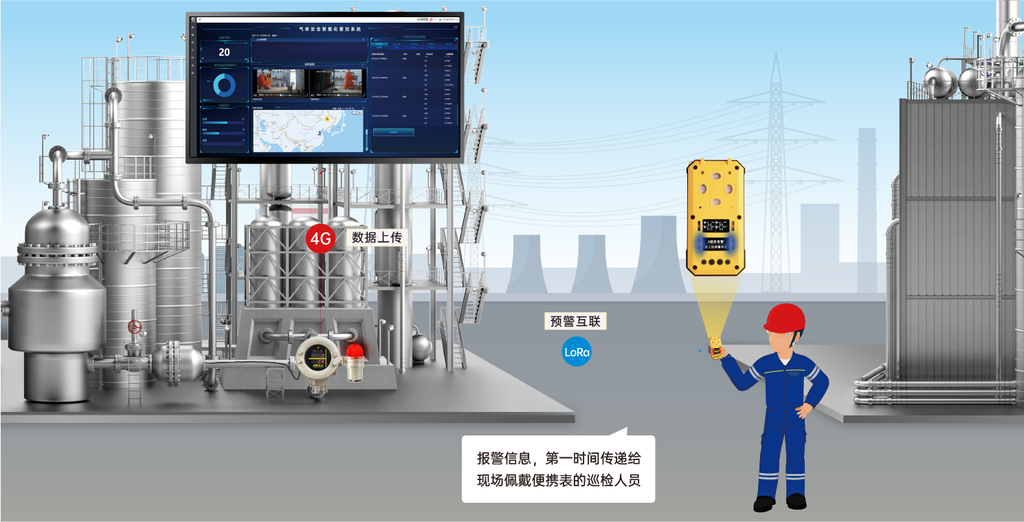我們認(rèn)為現(xiàn)場(chǎng)的一線工人是最需要在第一時(shí)間接收到報(bào)警信息的人,基于此點(diǎn)我們自主研發(fā)了氣體檢測(cè)預(yù)警互聯(lián)系統(tǒng)和氣體安全智能化管控系統(tǒng),是氣體檢測(cè)技術(shù)與物聯(lián)網(wǎng)技術(shù)的完美結(jié)合,解決了一線工人不能第一時(shí)間接受到報(bào)警信息、固定表無法數(shù)據(jù)上傳平臺(tái)的問題,并且將此專利技術(shù)應(yīng)用于便攜式設(shè)備和移動(dòng)式設(shè)備上,在不同應(yīng)用環(huán)境下,通過不同設(shè)備的組合,將氣體報(bào)警升級(jí)為氣體預(yù)警,有效的提高了一線作業(yè)人員的生存幾率。