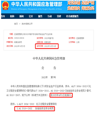2023年4月1日,《加油站作業安全規范》(AQ3010-2022)將代替AQ3010-2007并正式實施。相較于傳統內容,新規范結合了手機支付廣泛普及的時代特點,允許在設置可燃氣體聲光報警裝置的情況下進行手機支付。